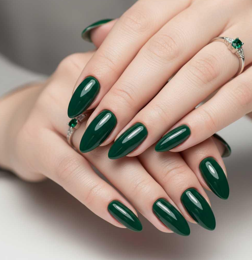 Let the color do the talking by keeping your outfit in neutral or jewel tones — think ivory, charcoal, or burgundy. Pair with emerald or silver jewelry to make the green pop even more. And the almond shape? It adds that elegant, almost vintage vibe that makes this manicure feel like old money wrapped in holiday magic.