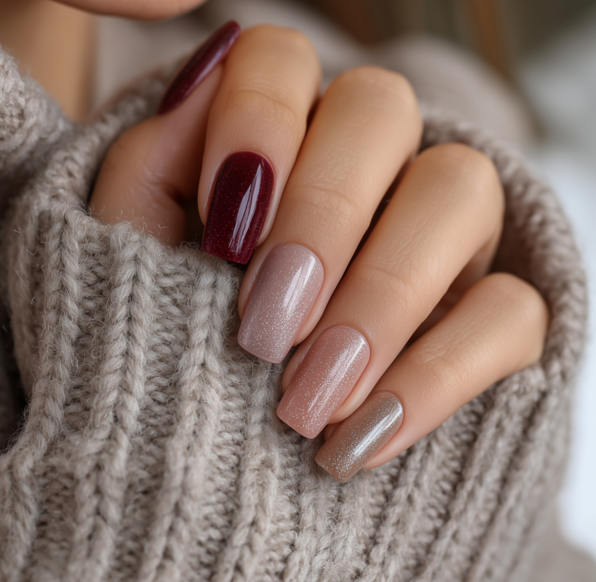 This luxurious velvet nail design combines rich burgundy with soft shimmer shades for the ultimate winter manicure. The mixed color palette featuring deep wine, dusty rose, and champagne sparkle creates a cozy yet glamorous look that's perfect for cold weather.