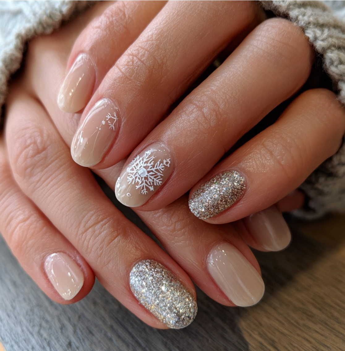 Snowflake nails are a classic winter nail design that never goes out of style. The minimalist approach with just a few accent nails keeps it sophisticated rather than overdone. The nude base makes it versatile for any occasion while the snowflake details add seasonal charm. Perfect for holiday parties, winter events, or everyday wear.