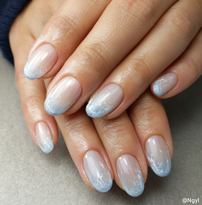 Frosted nails capture the essence of winter with their frosty, ethereal appearance. This modern take on the classic French manicure adds subtle sparkle that mimics freshly fallen snow. The pale blue glitter gradient creates a soft, romantic look that's ideal for winter weddings, holiday parties, or everyday glamour. It's sophisticated enough for any occasion yet festive enough to feel special.