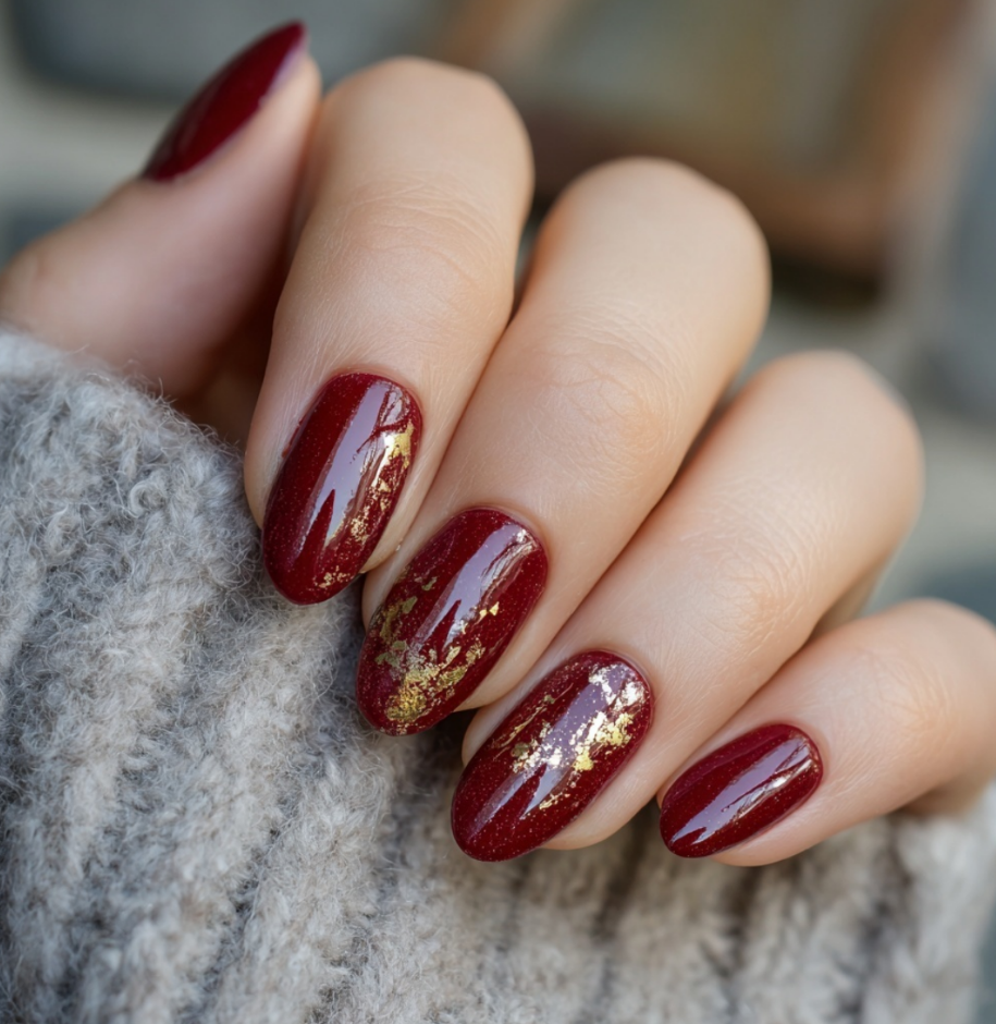 This stunning garnet red manicure with gold foil accents is pure winter elegance. The deep jewel-toned base paired with delicate gold leaf details creates a festive look that's perfect for the holiday season.