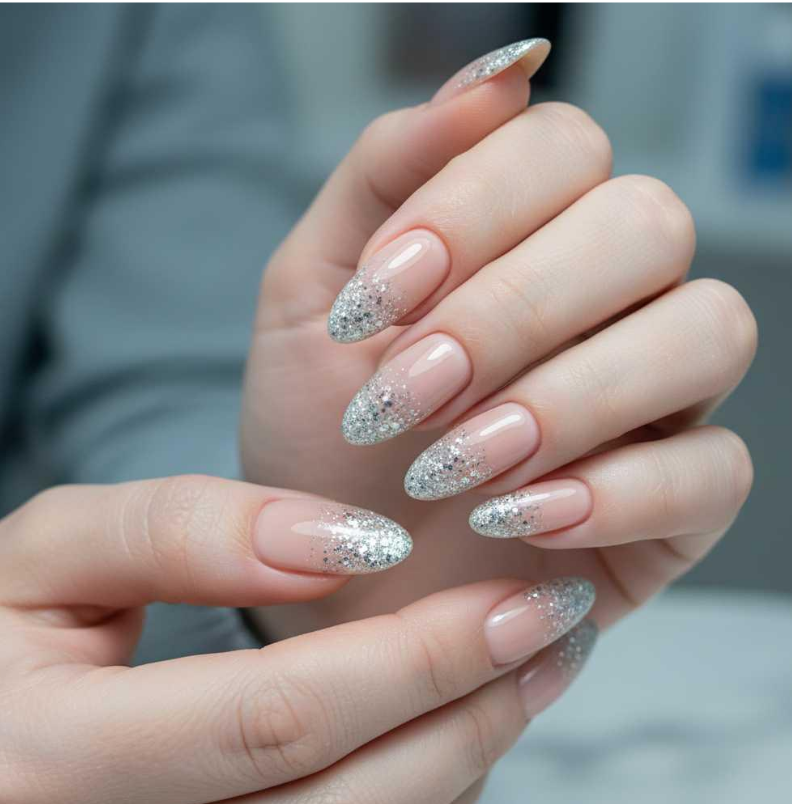 This nude-to-silver ombré manicure brings soft sparkle to winter in a subtle, elegant way. The sheer nude base fades into fine silver glitter, creating a frosty, light-catching finish that feels festive without being too bold.